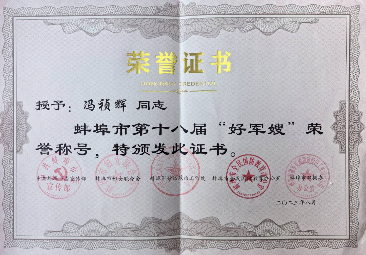 日前,蚌埠市第十八届“好军嫂”和“最美军嫂”名单公布,我公司冯祯辉同志被中共蚌埠市委宣传部等5部门联合授予“好军嫂”荣誉称号。